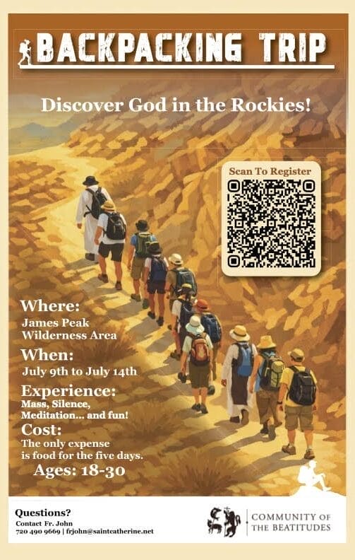 A mountain retreat for young adults (18-30 years old), near Denver! Come and boost your faith! Talks, Adoration, Liturgy, Hikes, Recreation, and more Camping in tents (option stay in retreat...